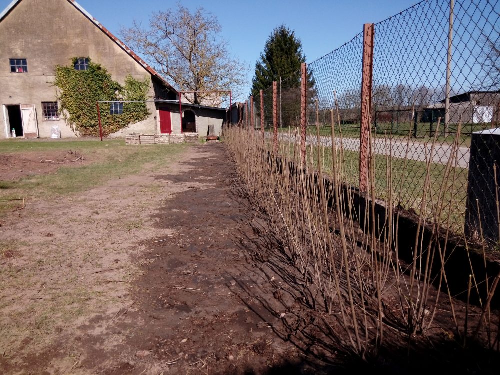 Nachdem der Umzug der Pflanzen erledigt war, wurde ein tiefer Graben gegraben, um dort 94 Heckenpflanzen ein neues zu Hause zu geben. Es gibt schönere Arbeiten, als Hecken einzupflanzen, aber wenn man sieht, dass jede einzelne grünt und sprießt, dann weiß man wofür. Im Moment können wir noch locker durch und über die Hecke schauen, aber sie wird von Tag zu Tag dichter.